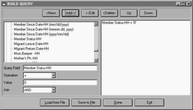 The information above will print for each member included in the query. It is important to note here that when using any field from one of the seven family database folders, all other data fields must come from one of those seven folders. For example, "First and Last Name - S" cannot be on the same report as "Last Name, First Name, Middle Name" from the Membership Information folder. Information from the family database folders cannot be joined with the financial folders. Likewise, queries must be built using data fields from one of the seven folders. A typical query might be Member Status - HH = 0 to pull only those families who have a Head of Household with Active Member Status (if 0 is what is used in your database to represent active member status). See the query screen below:
