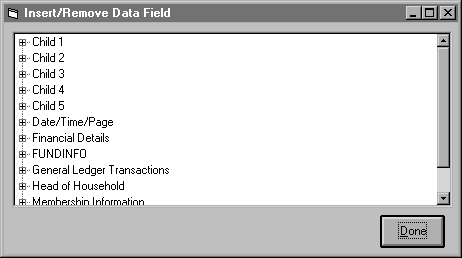 The new folders will be: "Child 1," "Child 2," "Child 3," "Child 4," "Child 5," "Head of Household," and "Spouse." If you open the Head of Household folder by clicking on the plus sign to the left of the folder, you will see all of the fields from the Membership Information, each with a Head of Household label. The same is true for the spouse and children folders.