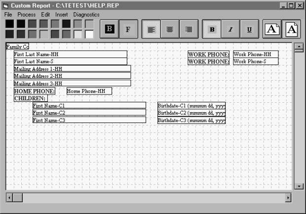 For a typical family directory, click on "Family Code - HH", "First and Last Name - HH", "Mailing Address 1 -HH", "Mailing Address 2 -HH", "Mailing Address 3 - HH" (which will include the city, state, and zip code), "Home Phone -HH", and "Work Phone - HH" in the Head of Household folder. Then open the Spouse folder and click on the following: "First and Last Name - S" and "Work Phone - S". Open the Report - C1 folder and click on "First and Last Name - C1" and "Birthdate (mmmm, dd yyyy) - C1". Do the same for each child folder up to five, unless you know that the largest family in your congregation has 3 children (as we assumed in the example below). Add text fields as desired. Your screen will look something like the one below: