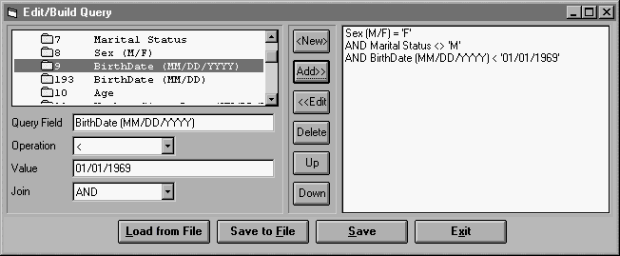 For the Birthdate, we will select Birthdate(mm/dd/yyyy) < 01/01/1969. For date fields, the format of the Value must match the format of the field as shown in parentheses. This line of query will pull everyone born before Jan. 1, 1969, or all those over 30. Clicking <Add> after each line of query is entered results in a screen that looks like the one below: