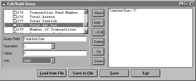 Another example of a query might be printing statements only for members who owe money. This isn't specifically represented in the database while performing data entry but can be calculated by the system if you use one of the Financial Query Fields. In this case, we would use the field "Total Amount Due." Set the Operation as ">" and the Value as 1 to print statements for people who owe more than $1.00. Click <Add> to move the line of query to the right side of the screen. Your query would look as follows: