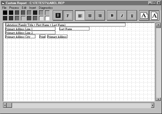 Next add data fields by selecting [Insert] [Data Fields]. Click on the plus sign next to Membership Information to see the available query fields. Click the following fields so that they appear on your graphical display: "Salutation + Family Title Code + First Name + Last Name", "Primary Address Line 1", "Primary Address Line 2", "Primary Address City", "Primary Address State", "Primary Address Zip Code", and "Last Name". Arrange these as you would like them to look on a label - "Last Name" will be used as a sort and suppressed so it's not important where you place it. See the screen below: