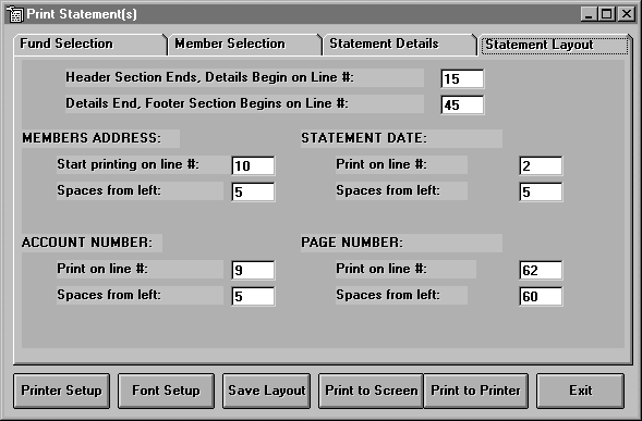Enter the Line number that you want the members address to appear on for the Statement and number of spaces from the left edge of the paper that you want to begin printing the Address. It cannot be more than 40 spaces from the left or it may run off the side of the statement. Also, because a member may have 4 lines of address, the starting line number for the Address must be at least 4 lines above where the header ends.