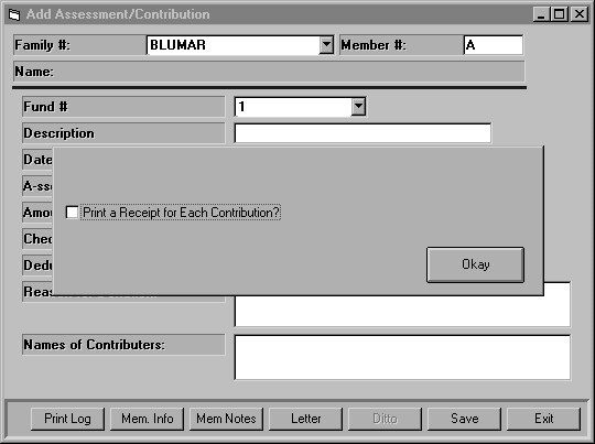 A dialog box will appear in the middle of the screen after you select this program. The dialog box will have a prompt asking you if you want to print receipts. If you do, click the box and click OK. Leave it blank and click OK if you do not want to print receipts with each contribution entered.