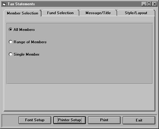 On this screen, select whether to print for all members, a range of members, or a single member. If you select a range of members, you will be asked for the beginning and ending Family and Member Code. If you select a single member, you will be asked for the Family and Member Code.