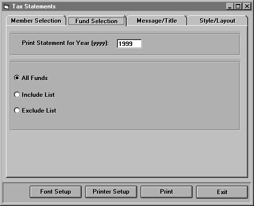 Enter the appropriate tax year. You can print tax statements for all funds, only funds on an include list, or only funds not on an exclude list. If you select an include list or exclude list, a list of funds will appear to the right. Mark the funds you wish to include or exclude.