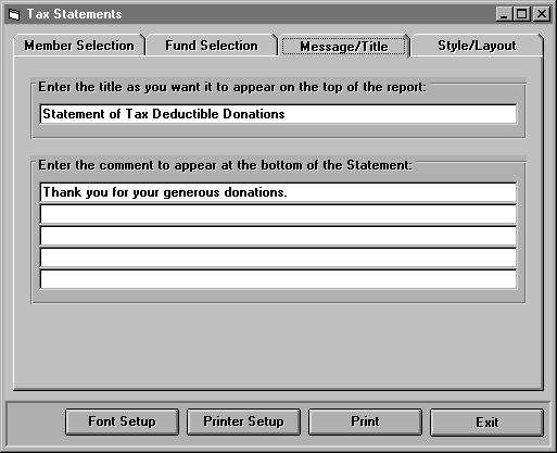 You can address the statements using the Individual Title Code or the Family Title Code. Then select whether to print all details or a summary report (all contributions listed by fund).