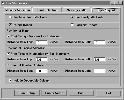 The next three sections allow you to place the date, temple address, and member address on the statement. The first two are optional in case you use preprinted statements. Finally, click Include Deductible Column to include deductible amounts on the statement for your members.