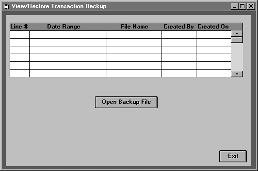 The View/Restore Transaction option, located under the System sub-menu, is used to browse and restore Transaction Archives created using Backup Transactions. When you select this option the following screen will appear: