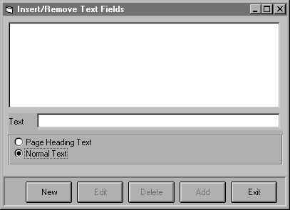 To add a text field, such as NAME, click <New>. Then you must decide if you would like the text to appear as a page heading (only once on the page) or as normal text (once per record).