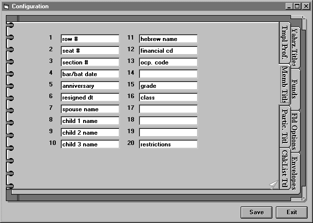 The User-Defined Participation Fields are displayed on the next page. You can access them by clicking on the lower right hand corner to turn the page or by clicking on the tab "Partic. Titl." There are 60 user defined fields which all hold data for a one character code only. You can enter such titles as "Brotherhood," "Sisterhood," or "Adult Education" to keep track of membership information. These fields can hold one character codes; for example, for "Brotherhood" your codes may be: