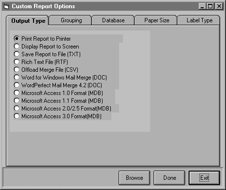 If you select any option besides "Print to Printer" or "Display to Screen", you will be asked for a filename for the resulting file containing the information on the report. If you are merging with Word for Windows or Word Perfect, this file will be used as the Data Source during the Merge.
