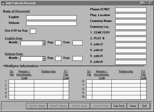 You will then move to the Plaque and Cemetery fields and the six user defined fields for Yahrzeit Records. These user-defined fields can be set up in the Configuration Screens.