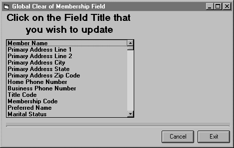 Select the field you wish to clear and the system will ask you if you are sure you want to clear all data for this field. If you respond yes the system will clear the field for every member on file. When you are finished clearing fields click the <Exit> button to return to the main menu.