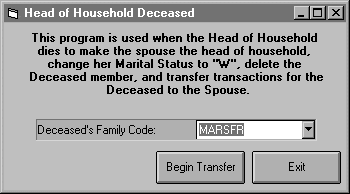 When you select "Head HouseHold Deceased" from the Membership sub-menu the following screen will appear.