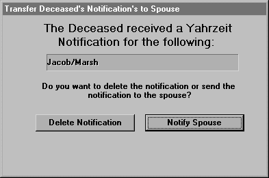 When the Head of the Household dies, you may want to make the spouse the head of household and transfer any financials and Yahrzeit notifications to her. The original head of household will be deleted from the system when you use this option.
