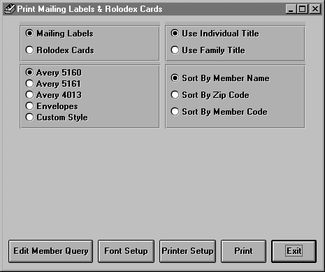 To print Mailing Labels and/or Rolodex Cards for members use the Mailing Labels/Rolodex Cards option located under the Reports sub-menu. When you select this option the following screen will appear: