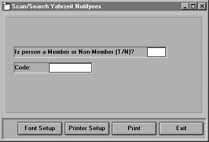 The "Scan/Search Yahrzeit" prints a report of all the Yahrzeit records that a Member or Non-Member are linked to in the system. When you select this option the following screen will appear:
